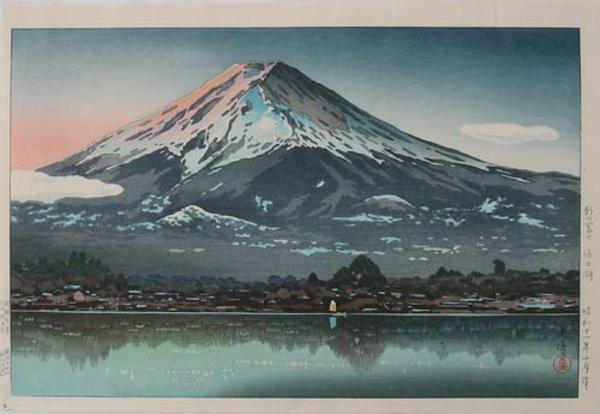 This print shows one of the famous subjects of the shin hanga era: Mt Fuji from Lake Yamanaka. It is a lovely image with sunlight bathing the upper slopes of Mt. Fuji. The image size is approximately 10.25"x15.5".