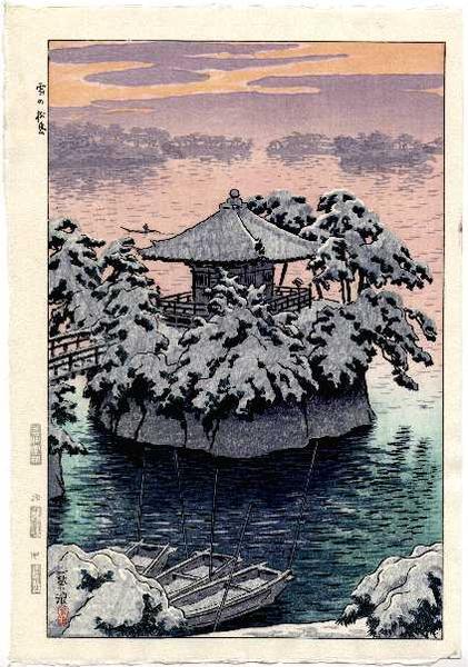 Beautiful wintertime “snowy temple” image by Shiro Kasamatsu (1898-1991) titled ”Yuki no Matsushima” (translates as “Snow at Matsushima”). Although this image is undated in its margins, Dr. Andreas Grund's superb reference indicates it (#U-40) was carved and first printed in “Showa 29” (1954). Print bears black, rectangular Unsodo Han publisher’s seal in the left margin, along with names of printer (Shinmi—no longer working, now in his 90’s) and carver (Nagashima). Also bears “Gei” watermark (“gei” is the first kanji character of the of the Unsodo Publishers name, "Un-so-do,” which is spelled “gei” if alone) in the lower left corner. Circa likely 1960’s/70’s/possibly 80’s.