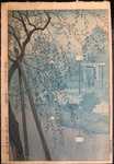Shiro resumed his work with Watanabe in the 1930's. His designs were mainly of landscapes, but also included bijin-ga, interiors, and Noh masks (one of his particular interests). Western collectors were especially attracted to his romantic landscapes depicting traditional Japanese life and landmarks. Shinobazu Pond, published in 1932, was so popular that it was continually reprinted throughout the 1930's and 1940's. It was published in several different color combinations, including an aizuri-e (blue) version. In this print and many others, Shiro used foreground elements like branches to draw in the viewer and give the image depth. This was a design technique first originated by the ukiyo-e artist Hiroshige.