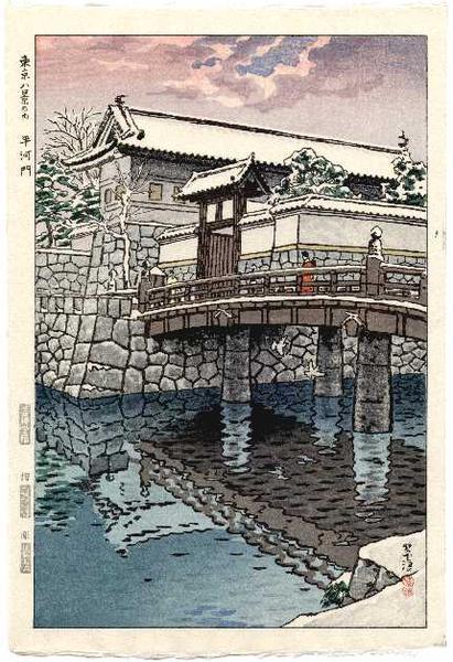 A beautiful bridge reflection scene titled in Japanese kanji (left margin) as "Tokyo Hakkei no Uchi - Hirakawa Mon" which translates in English as "Eight Views of Tokyo - Hirakawa Gate" by Shiro Kasamatsu (1898-1991). Bears artist's signature/seal in lower right corner of image. Print bears Unsodo's Publisher's rectangular seal in left margin along with the carver/printer seals of Nagashima/Shinmi. Print itself is undated, however another reference I have lists print as first produced in "Showa 28" (or 1953). Additionally, Nagashima (carver) is known to have worked for Unsodo during the late 1940's and 1950's; and Shinmi (printer) is currently in his 90's and has long since stopped working. Also bears "Gei" watermark ("gei" is the first kanji character of the of the Unsodo Publishers name, "Un-so-do," which is spelled "gei" if alone) in the lower left corner. Circa 1960's/70's (older paper).