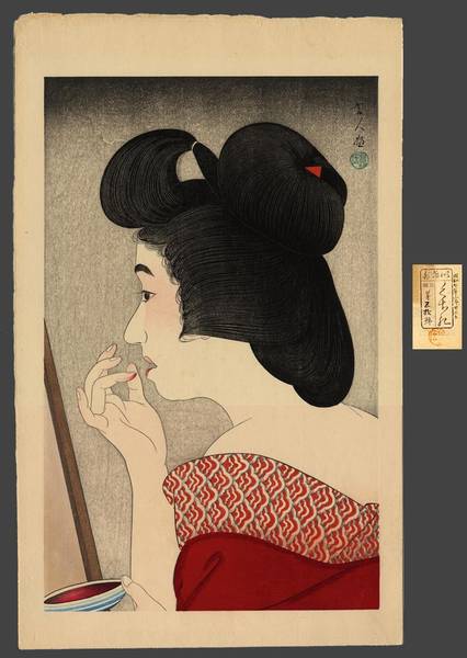 Artist: Torii Kotondo (1900-1976) Title: Rouge (30/100) Date Of Work: 1932 Publisher: Ikeda Dimensions: 18.875 x 11.625 Condition: Fine impression, color and condition. Notes: Original note on verso next to Ikeda sticker reading Showa 7, 1st month, 22nd day. Jan. 22, 1932. ---------------------------------- Later (Saru Gallery): Kuchibeni 口紅 Rouge lipstick
