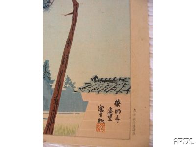 Yakushi Temple by Tokuriki Tomikichiro. Original woodblock print. Fair condition. Some repairs in washi. Chuban size measures 8.4 x 11.3 inches. Uchida seal in right margin. Title, artist's character's and red seal in lower right corner of image.