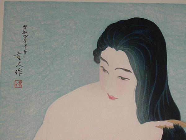 木版美人画●鳥居 言人(清忠)「裸婦髪梳き」タトウ入り