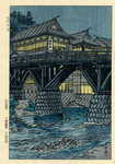 Subject: By the light of the moon, seen through the drenching rain the wooden bridge on stone plinths. 'Uzen Akakura'.
