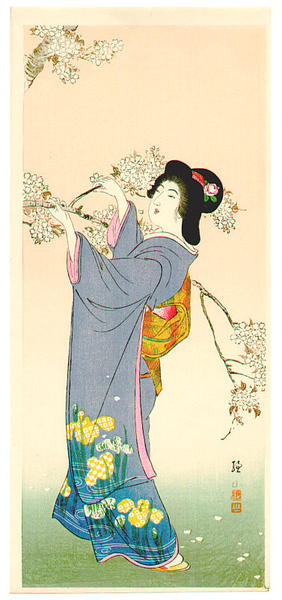 Title Lady and Cherry Blossoms Artist Sozan Ito 1884-? Signature Sozan Seal sozan Dated early 20th C Period Shin hanga Publisher Watanabe Impression excellent ... printed on a soft pliable Japanese paper Colors excellent Condition excellent Rating 1 = excellent Description "Setsugetsuka no Uchi" (The Snow, Moon and Flowers) Flower: A lady is trying to take a branch off from a flowering cherry tree. Format Mitsugiri-ban Width 6.9 inches = 17.5 cm Height 15.4 inches = 39.0 cm