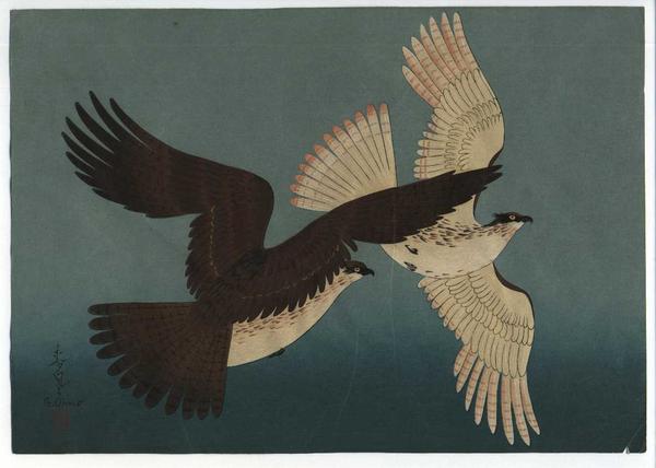 Falcons by Bakufu Ohno. Genuine woodblock print. 10.7 x 15.3 inches. Signed in Japanese and English in lower left of image above the red artist's seal and Shinagawa seal. Fair condition. Trimmed, backed by thick washi,and soiled as shown in scan.