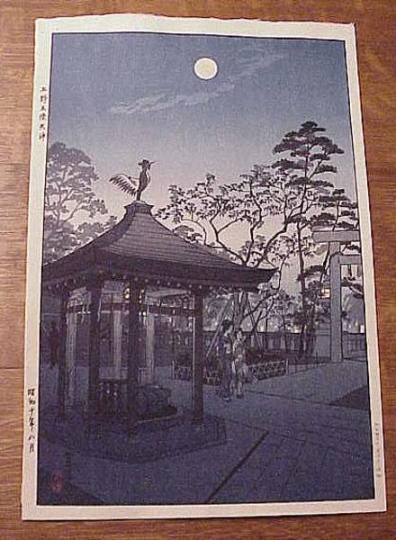 This is Night AT Gojo Tenjin Shrine, original owner has written the year and name of this print on the back side bottom margin and dates it 1935. Pristine condition, I couldn't get the colors right in my scan, it's more shades of indigo blue. Never matted or framed, it measures 10 by 15 inches.