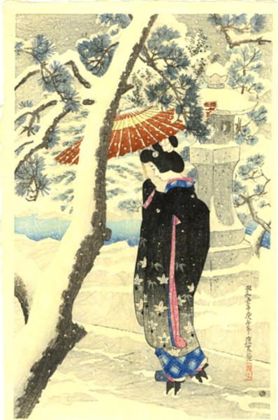 Artist: Shinsui, Ito, 1898-1972 Title: Shrine in Snow: Print and Keyblock Set Series: First Series of Modern Beauties Date: 1930 Medium: woodblock Dimensions: 16 x 10 1/8 inches Illustrated: Shinsui, pl. 57 |