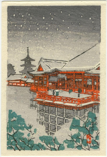 I still haven't taken that "Village Near Futamigaura" out of the frame, but I have found some other new things. First a set of Koitsu mini-postcards identified (by their box) as bridge tallies. The publisher is not noted, but your archive indicates they're by Shobido Tanaka. Attached are a photo of the whole set, plus a scan of four of the individual mini-prints. According to your catalog, the prints are: