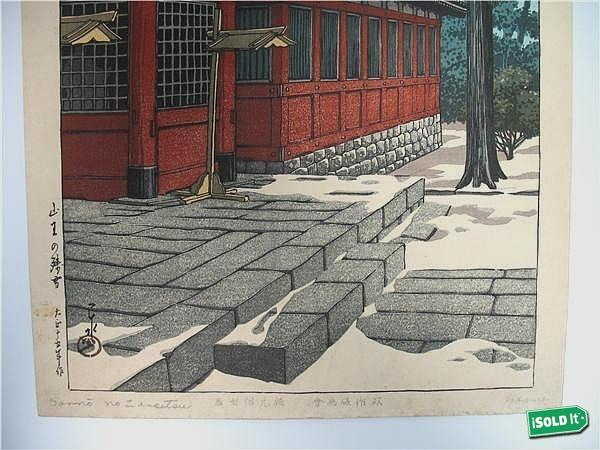 artist Kawase Hasui (1883-1957) signed 1926 overall size - 10.75" x 8.25 image area - 9.25" x 6.75" melting snow on the steps and walkway of shrine Japanese writing in left & lower margins small smudge mark near writing in left margin (photo) flat with no tears insert w/ info on Hasui excellent condition! |