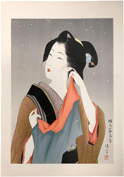 Kaburaki Kiyokata, 1878-1972 Light Snow, Customs of Young Women: Beauty of the Fifteenth Year of Meiji [1882] (Meiji Jugonen Koro no Fuzoku) Signed at lower right corner, Mo Taiso oh I, Kiyokata (copied after the inspiration of Master Taiso, by Kiyokata) with artist's red square seal (unread). Embossed hand-numbered limited edition and carver's seals verso, Nihyaku goju mai gentei, dai ju ni go, Katsumura hori (limited edition of 250, number 12, carver Katsumura). Possibly self-published by the artist, ca. 1925-35. Obaiban tate-e 50.7 by 36.6 cm Published: Japanese Art Diary, 2002