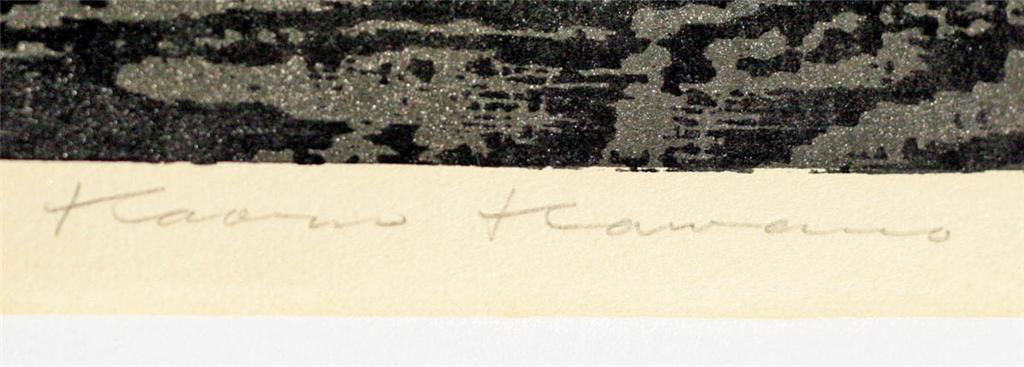 Kaoru Kawano is a noted Japanese artist who we believe departed us around 1965. These prints seem to have everything going for them, the artist name is in the images, the prints are hand numbered 19/200 in pencil on the lower left hand border, they are both also signed in Japanese next to the numbering, they are clearly titled in the center and his name in English is clearly spelled on the lower right hand corner. On the reverse of the prints there is a label that says “SELF-CARVED SELF-PRINTED KAORU KAWANO” and appears to have an artist mark.