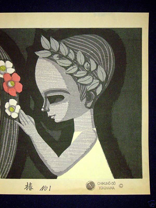 The size of this woodblock print is 17 1/2 x 12 1/4 inches, which is larger than the traditional Shin-Hanga woodblock prints. This woodblock print is not attached to any backing paper or cardboard and strong ink bleeding through can be seen from the back of the original mulberry paper. The artist’s signature is at the lower left corner of the print while the title of the print “Camellia, No 1” and the publisher’s chop mark “CHIKUHO-DO, YOKOHAMA” are in the bottom border. Except for two very minor and light horizontal creases in the images; and one vertical crease about 1/4 inch outside in the images in the border, which does not affect the images, this woodblock print is in excellent condition. |