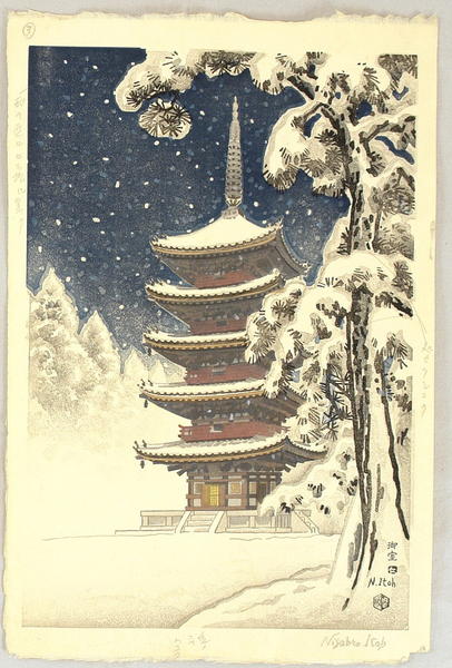 Title Muro Temple in Snow - Trial proof print provenance: Uchida Family Archives. Artist Nisaburo Ito 1910-1988 Signature "Nisaburo Itoh" on the print. Dated Ca. 1930-50. Publisher Uchida. Medium/Technique Watercolor on paper. Impression Woodblock print. Excellent - very good. Printed on "Uchida" watermarked paper. Colors Very good. Condition Very good ... The print has some pencil indications of correction by the artist. Description The very rare original hand painting of Muro-ji temple and a trial proof with annotations by the artist. They indicate some places of the tree should be darker, etc. The exceptional and rare items for the serious Japanese woodblock print collector, who wants the fine example of the creative process of commercial print production. Note Uchida Han is an important Japanese publishing company with branches in both Tokyo and Kyoto. Founded in 1919, the company is still in existence today as an active publisher of shin-hanga in addition to publishing re-strikes of Edo period ukiyo-e prints. Format Dai-Oban Width Item 11.7 inches = 29.8 cm Height Item 17.8 inches = 45.3 cm |