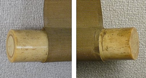 全体に経年感があって、きついヤケ、ヨレ、粒染みが見受けられます。また軸下部に、旧蔵者によると思われる押印があります。箱は比較的新しい品ですが、若干の染みがあります。
