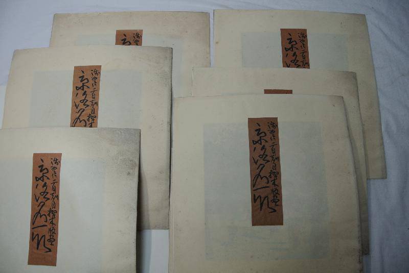 カバーの大きさが約39×36㎝・版画自体の大きさが約30×26.5㎝です。カバーには経年の湿気やシミ・折れなどがみられますが、版画は7点ともにきれいな状態です。タイトルは「木屋町雪」・「大文字」・「祇園小雨」・「平安神宮」・「北野神社」・「三十三間堂」・「東山」です。 |
