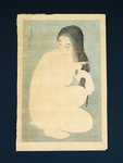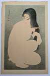 Torii Kotondo Combing Hair (Kamisuki). From the Twelve Aspects of Women Series. Dated: 1929 (numbered first edition) Edition: 119 of 300 (Numbered by hand on verso as part of embossed stamp. Paper size: 18.25 x 11.75 inches. Publisher: Kawaguchi (sealed at right margin). Carver: Ito. Printer: Komatsu. Seals at left margin. Artist's signature and seal. Embossed title at bottom margin. Medium: Japanese woodblock print. Condition: Tone line near image edge. Back has two dots of foxing. Original drying pinhole in left margin. |