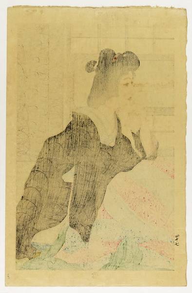 Torii Kotondo (or Torii Kiyotada VIII) is renowned for his paintings and shin hanga prints of beautiful women. His woodblock prints, superbly carved and printed, are comparable with those of Hashiguchi Goyo and Ito Shinsui. Kotondo was born with the name Saito Akira in the Nihonbashi district of Tokyo. He was the only son among the five children of Torii Kiyotada, the seventh Torii master. The Torii school had a long tradition of painting and printmaking for the Japanese theater, extending back to the seventeenth century. Kabuki theater was still very popular in the early twentieth century and prints and painted posters were the primary means of publicity. Although Kotondo was mainly interested in studying history and archaeology, it was assumed that he would follow in his father's footsteps and join the Torii school. At age 14, Kotondo agreed to leave school and begin studies with Kobori Tomone, a yamato-e painter. Along with painting classes, Tomone taught Kotondo about the court and military practices of ancient Japan, satisfying his interest in history. A year later, he was officially adopted as the next heir of the Torii school and assumed the artist's name 'Kotondo'. While still studying with Tomone, he began designing illustrations for a theatrical magazine, Engei Gaho ('Entertainment Illustrated Magazine'), and painted kabuki posters and billboards. Torii Kotondo was the 8th Torii and the 5th Torii Kiyotada. His father was the 4th Kiyotada.