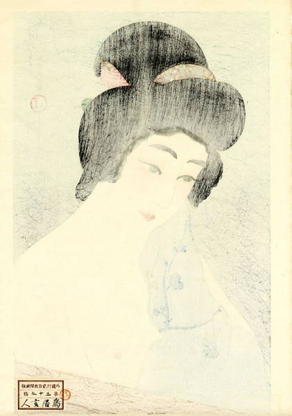 Artist Torii Kotondo Title "Yuge" (Vapour) Medium Original Limited Edition Japanese Woodblock Print Editions: 200 (S&K paper seal), 300 (S&K embossed seal), ?? (Kawaguchi). Date 1929 October Publisher Sakai and Kawaguchi Reference No Female Image # 171; The New Wave #263 Size 18 x 11 -3/4 " (sheet) Dimensions 18.125 x 11.875