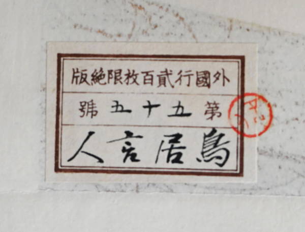 Notes: First state, paper label on reverse: # 55/200. Signed: Kotondo ga. Publishers: Sakai-Kawaguchi (stamp Sakai-Kawaguchi gōhan). Dated: 10th month of Showa 4 (1929). |
