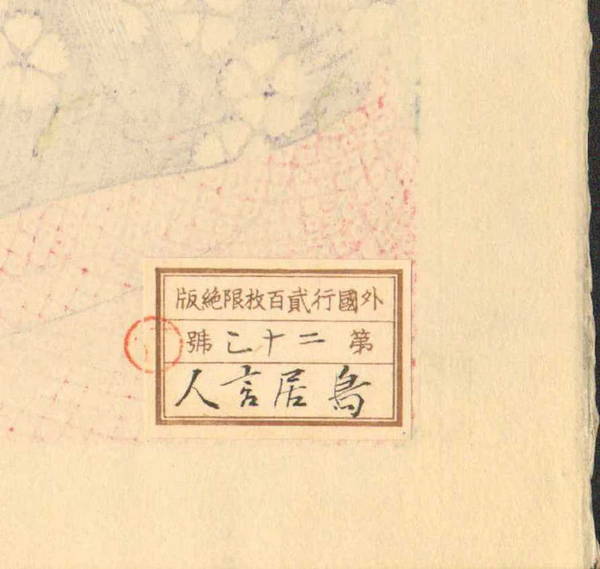 Date 1929 Publisher Sakai/Kawaguchi Edition of 200. The highest edition number I have confirmed to date is #136. It is statistically unusual to have not seen even a single edition between 137 and 200, despite numerous examples of editions up to 136, so I suspect the full edition was not sold.