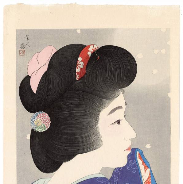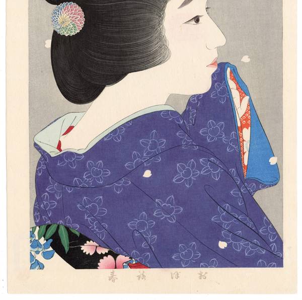 | Torii Kotondo (or Torii Kiyotada VIII) is renowned for his paintings and shin hanga prints of beautiful women. His woodblock prints, superbly carved and printed, are comparable with those of Hashiguchi Goyo and Ito Shinsui. Kotondo was born with the name Saito Akira in the Nihonbashi district of Tokyo. He was the only son among the five children of Torii Kiyotada, the seventh Torii master. The Torii school had a long tradition of painting and printmaking for the Japanese theater, extending back to the seventeenth century. Kabuki theater was still very popular in the early twentieth century and prints and painted posters were the primary means of publicity. Although Kotondo was mainly interested in studying history and archaeology, it was assumed that he would follow in his father's footsteps and join the Torii school. At age 14, Kotondo agreed to leave school and begin studies with Kobori Tomone, a yamato-e painter. Along with painting classes, Tomone taught Kotondo about the court and military practices of ancient Japan, satisfying his interest in history. A year later, he was officially adopted as the next heir of the Torii school and assumed the artist's name 'Kotondo'. While still studying with Tomone, he began designing illustrations for a theatrical magazine, Engei Gaho ('Entertainment Illustrated Magazine'), and painted kabuki posters and billboards. Torii Kotondo was the 8th Torii and the 5th Torii Kiyotada. His father was the 4th Kiyotada.