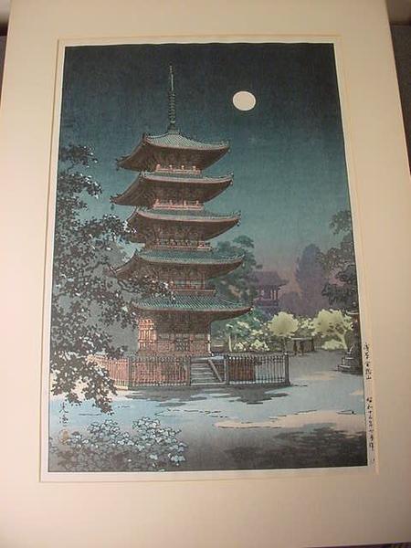 FROM THE ESTATE OF 96 YEAR OLD LADY WHO LIVED IN JAPAN COMES THIS OLD JAPANESE WOODBLOCK PRINT OF A PAGODA. 17 INCHES BY 11.2 INCHES. IN GOOD CONDITION.