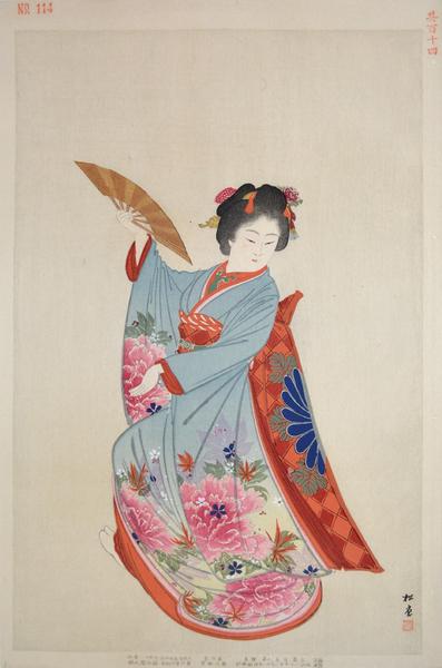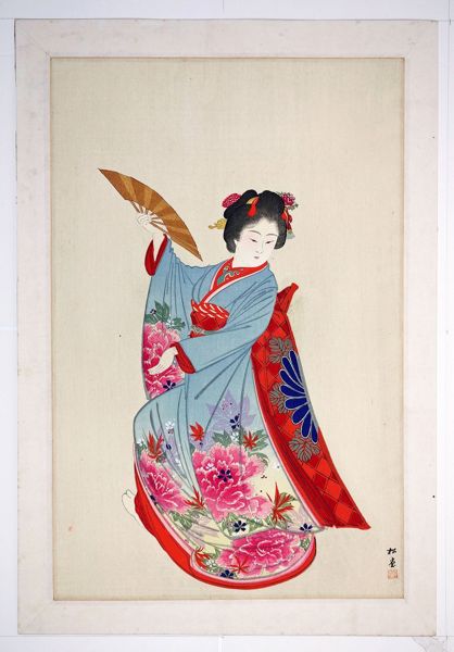 Shodo Maiko: Dancing Girl Series: One Hundred Beauties Medium: Woodblock Print Date: 1903 Size: 17" x 11" Signature: Shodo Publisher: Wakita Ainosuke Seals: Shodo Condition: Very fine color, impression and state. |