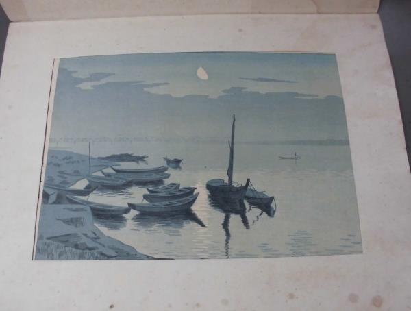 Notes (this edition) These notes were written by the original owner/seller/auctioner of the item and may be inaccurate.: | Title Scenery of New Osaka - The Moon over the Shin-Yodo River early printing before W.W.II Artist Takeji Asano 1900-1999 Description "Shin Osaka Fukei no Uchi" (Scenery of New Osaka). "Shin Yodogawa Yuzuki". The moon over the Shin-Yodo river. Signature "Takeji ga-to" on the bottom right. "Takeji suri" on the left margin.. Seal Asano. Dated 1934. Medium/Technique Woodblock print. Impression Very Good ... Self-carved and self printed by the artist. Colors Very good. Condition Excellent - Very Good. Width Item 14.6 inches = 37.0 cm Height Item 10.2 inches = 26.0 cm |