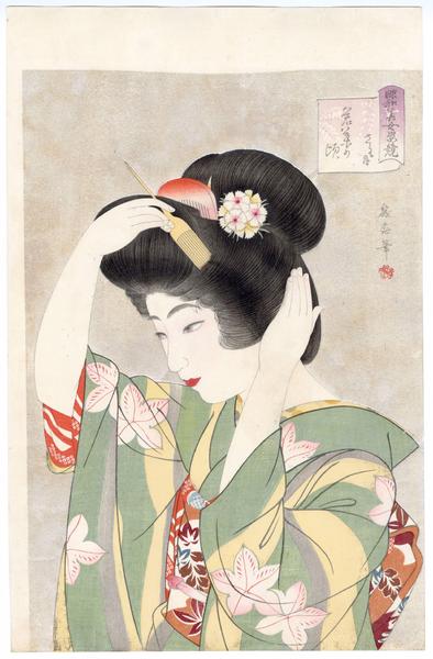 Notes (this edition) These notes were written by the original owner/seller/auctioner of the item and may be inaccurate.: | Watanabe Ikuharu May - Season of Young Leaves Competing Beauties in the Showa Era, 1927 Woodblock Print 16.75 x 10.87 in |