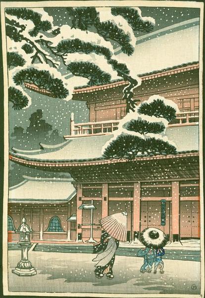 I have one other oddball piece which I'm curious if you have seen before. Mr. Mueller had several chuban Hasui which he said that Watanabe gave to important clients as Christmas gifts. I have an unsigned print which has been creped down to Chuban size but I honestly cannot tell whether it is Hasui or Koitsu. It looks like a prototype for Zojoji temple in snow. The angle is more like Hasui, but the treatment of the trees is more like Koitsu. I was wondering if you have seen this particular image before and might have some idea about its origins. |