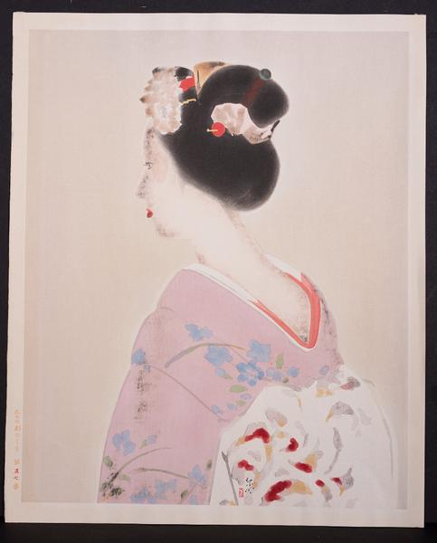 Maiko from a series of Four Maiko by Terashima Shimei. Original Japanese woodblock print circa 1961. Edition 57 of 200 in left margin. Exceedingly nice details including gold inks and deep embossing on inner kimono. Very nice |