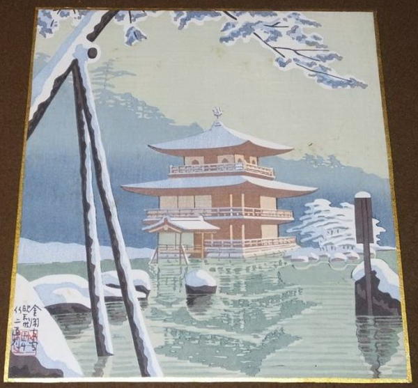 Kinkakuji in winter Size: 26 x 30.2 cm. Self-printed in 1955-58. From a seldom seen series of famous views of Kyoto. In its original paper mat and folder. |