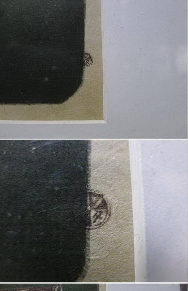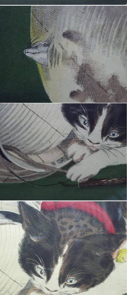 提灯の中に逃げ込んだ鼠の尻尾を押さえる猫。その一瞬の動きを微妙な光の中にとらえる。猫の毛並みやひげ、光のよって諧調を変える提灯の描写は特筆もの。銅版画風の細かな点描表現が、木版で達成されたのは驚きですらある。清親初期を代表する超絶技法木版。