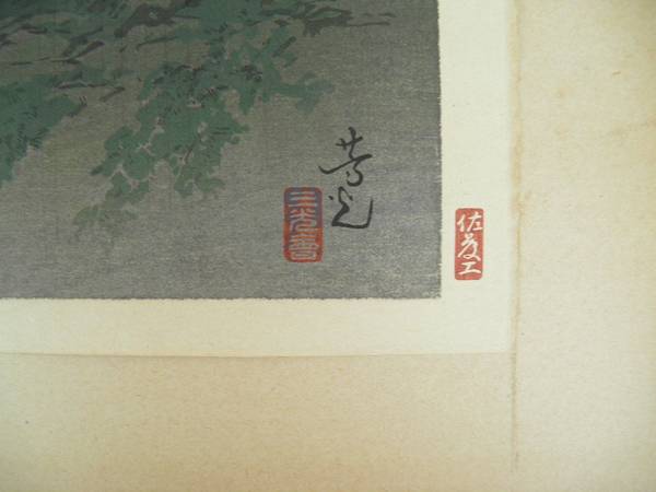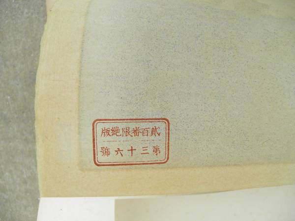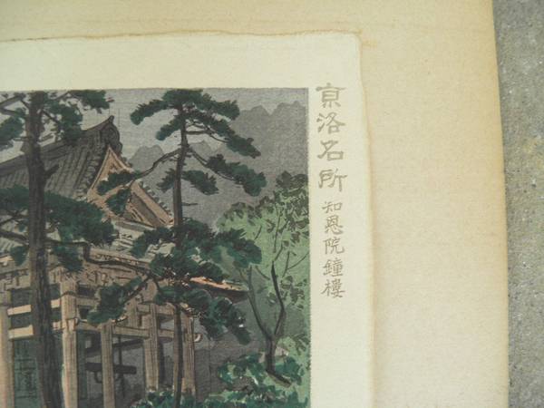 | Great Bell at the Chionin Temple from the series Kyoraku Nesho (Famous scenes in Kyoto) by Nomura Yoshimitsu. Original woodblock print circa 1931. 9.6 x 15.0 inches. Same print displayed in the 1936 Toledo Exhibition. Print is in fine condition. Limited edition of 200 prints with edition stamp on the verso s(see verso image which reads: Ni Hyaku Ban Kagiri Zeppan Dai Hayaku Hachii Go.) Japanese title and Sato of Kyoto publisher's seal in right margin. Yoshimitsu characters and red Sankokai-in seal in lower right of image. 18 blocks used with 25 superimposed impressions. Compare with image 284 in the 1936 Toledo Exhibition Catalog. Rare and beautiful. Later editions do not contain the edition seal on the verso. |