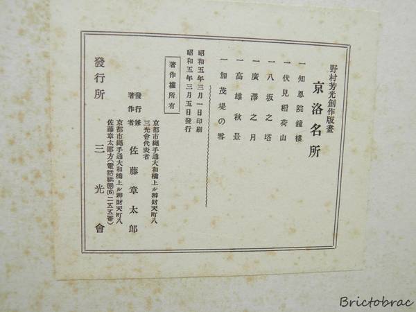 | Published on the 5th of March, 1930, as a series of six prints in a limited edition of two hundred sets by Sato Shotaro. The series was sold as a set of all six scenes in a cardboard tatou folder containing the series and print titles, dating (March 5, 1930) and publisher information. Interestingly, there are also two extra scenes containing the series title that were not included in the series set: The Daimonji Festival, and The Sloping Path to Kiyomizu, so perhaps they were issued after the release of the six-print set. |