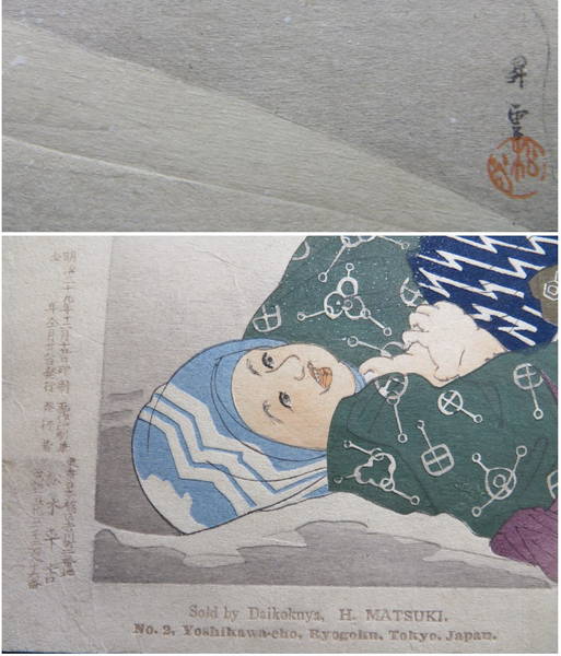 【絵師】山本昇雲 【時代】明治時代 【寸法】34,5×23,5 【状態】裏打なし、摺良、色目良、中折れ、少汚れ、少破れ |