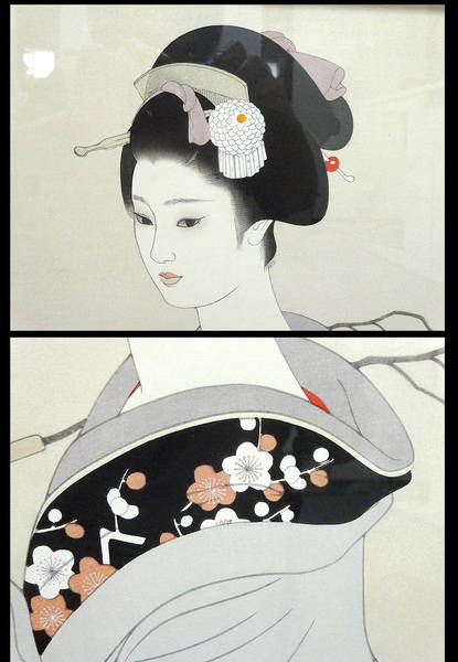 Tatsumi Shimura is known for designing several striking bijin-ga prints towards the end of the Shin Hanga movement. Born in Takasaki, Gunma, Shimura's real name was Sentaro. In 1921, he began studying art with Yamakawa Saiho, a well-known illustrator. Three years later, he became an apprentice of Saiho's son, Yamakawa Shuho, who was also a bijin-ga artist. Shimura exhibited paintings with Kyodotai in 1927 and with Seikinkai in 1938. He became known for his paintings of beautiful women with long eyelashes and blurred pupils. As a young man, Tatsumi also worked as an illustrator for newspapers, serialized novels, and magazines, notably for the Japanese magazine "Woman's world" (Fujokai). His most famous illustrations were for the novel Tange Sazen by Hayashi Fubo. From 1948 to 1952, Shimura designed several woodblock prints of beauties that were published by Kato Junji. Later he collaborated with the Japanese Institute of Prints (Nihon Hanga Kenkyusho) to create a series called "Five figures of modern beauties" (Gendai bijin fuzoku gotai). These prints were first published in 1953 in an edition size of 200 and contain a thin red rectangular Gihachiro supervisor seal (Okuyama Gihachiro was the founder of the publisher). The series was later reprinted using recarved blocks in the 1960s/70s/80s in other edition sizes of 100, 200, and 300, plus an open (unlimited) edition (see here for further details). They depict Japanese women in traditionally feminine poses and attire. The finely detailed figures are juxtaposed against very simple backgrounds. Tatsumi later published various other gorgeous bijin-ga in double-oban size via the publisher Momose in the 1980s. 志村立美(しむら たつみ、1907年2月17日 - 1980年5月4日)は、日本画家、挿絵画家・ 美人画家である。群馬県高崎市生まれ。本名 仙太郎。群馬県高崎市生まれ。 神奈川県立神奈川工業高等学校図案科を中退して、1924年(大正13年)山川秀峰に入門美人画を修める。 当時、山川秀峰は鏑木清方と伊藤深 水と共に、挿絵での活動もしていた。 山川秀峰の推薦を受け、立美も挿絵での活動を行うようになる。肉筆画も鏑木清方主宰の郷土会、師である山川秀峰、伊東深水らの主宰する青衿会等へ出品をする。 その後主婦の友・婦女 界などの雑誌口絵などでその名を知られるようになり、林不忘原作の丹下左膳の挿絵などで岩田専太郎と並ぶ人気画家となる。晩年、挿絵での活動を休止し、本来の立美の原点である日本画、美人画への回帰をしていく。 出版美術家連 盟会長などをつとめ、1976年(昭和51年)作品集『美人百態』で日本作家クラブ賞を受賞する。「現代女性十二態 花吹雪」 木版 東京国立近代美術館所蔵 |