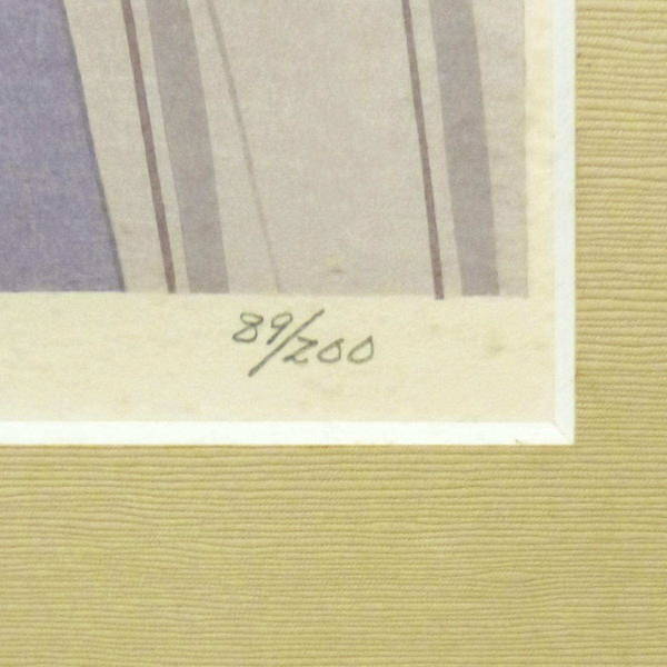 Tatsumi Shimura is known for designing several striking bijin-ga prints towards the end of the Shin Hanga movement. Born in Takasaki, Gunma, Shimura's real name was Sentaro. In 1921, he began studying art with Yamakawa Saiho, a well-known illustrator. Three years later, he became an apprentice of Saiho's son, Yamakawa Shuho, who was also a bijin-ga artist. Shimura exhibited paintings with Kyodotai in 1927 and with Seikinkai in 1938. He became known for his paintings of beautiful women with long eyelashes and blurred pupils. As a young man, Tatsumi also worked as an illustrator for newspapers, serialized novels, and magazines, notably for the Japanese magazine "Woman's world" (Fujokai). His most famous illustrations were for the novel Tange Sazen by Hayashi Fubo. From 1948 to 1952, Shimura designed several woodblock prints of beauties that were published by Kato Junji. Later he collaborated with the Japanese Institute of Prints (Nihon Hanga Kenkyusho) to create a series called "Five figures of modern beauties" (Gendai bijin fuzoku gotai). These prints were first published in 1953 in an edition size of 200 and contain a thin red rectangular Gihachiro supervisor seal (Okuyama Gihachiro was the founder of the publisher). The series was later reprinted using recarved blocks in the 1960s/70s/80s in other edition sizes of 100, 200, and 300, plus an open (unlimited) edition (see here for further details). They depict Japanese women in traditionally feminine poses and attire. The finely detailed figures are juxtaposed against very simple backgrounds. Tatsumi later published various other gorgeous bijin-ga in double-oban size via the publisher Momose in the 1980s.