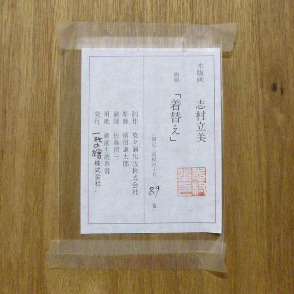 志村立美(しむら たつみ、1907年2月17日 - 1980年5月4日)は、日本画家、挿絵画家・ 美人画家である。群馬県高崎市生まれ。本名 仙太郎。群馬県高崎市生まれ。 神奈川県立神奈川工業高等学校図案科を中退して、1924年(大正13年)山川秀峰に入門美人画を修める。 当時、山川秀峰は鏑木清方と伊藤深 水と共に、挿絵での活動もしていた。 山川秀峰の推薦を受け、立美も挿絵での活動を行うようになる。肉筆画も鏑木清方主宰の郷土会、師である山川秀峰、伊東深水らの主宰する青衿会等へ出品をする。 その後主婦の友・婦女 界などの雑誌口絵などでその名を知られるようになり、林不忘原作の丹下左膳の挿絵などで岩田専太郎と並ぶ人気画家となる。晩年、挿絵での活動を休止し、本来の立美の原点である日本画、美人画への回帰をしていく。 出版美術家連 盟会長などをつとめ、1976年(昭和51年)作品集『美人百態』で日本作家クラブ賞を受賞する。「現代女性十二態 花吹雪」 木版 東京国立近代美術館所蔵