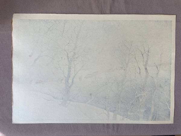 Print Specifics: - seldom seen Takashi image - published by Watanabe Shozaburo - dated 1950 - Watanabe 6mm seal lower left corner in image - from the artist's "Lake Towada" series - first edition printing |
