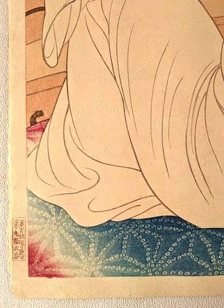 This impression is the rarely seen color variant with embossed "shibori" patterns on white kimono instead of regularly seen pink colored kimono. (The 3rd and the 4th images show the embossing).