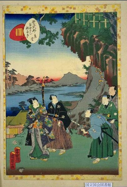 ARTIST: Kunisada II FORMAT: Oban, Tate-e. SIZE: 14.25. By 10. Ins. Approx SERIES: Murasaki Shikibu, Genji Karuta (Story of Genji). DESCRIPTION: 19, Usugumo. A gentleman is questioned by three samurai on his way to a tryst with his lover. DATE: ca 1860. PUBLISHER: Tsuta-ya. CONDITION: Good impression, colour and state. Retains Japanese album backing.