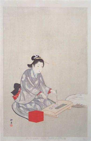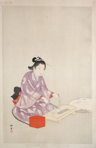 Shodo Ronin Annex High Ranking Housemaid Series: One Hundred Beauties Medium: Woodblock Print Date: 1902 Size: 17" x 11" Signature: Shodo Condition: Very fine color, impression and state Publisher: Wakita Ainosuke Seals: Shodo |