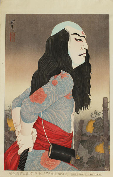 Subject: From series Gendai Butai Geika, #12. Onoe Shoroku II as the tattooed villain Danshichi. Together with its original descriptive text in Japanese and original folder (foxed as usual). Numbered 3 from the limited edition.