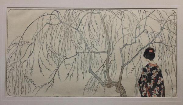 Notes (this edition) These notes were written by the original owner/seller/auctioner of the item and may be inaccurate.: | Dated 1901, this original Woodblock Print is signed in the lower right hand corner. We have not been able to decipher this artist’s name. This woodblock measures 7 ½ inches by 14 ¼ inches and depicts a Japanese lady admiring a Willow Tree. The glass is missing from the 16 ½ by 23 ¼ inch original wood frame. The wide matte is also original; however, there is a water stain on the right hand side. This early 20th century matte should be replaced anyway. |
