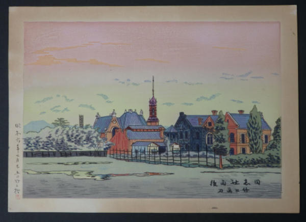 Title After Rain at Doshisha University first edition, before W.W.II Artist Takeji Asano 1900-1999 Description "Doshisha U-go" The red sky after rain over the old western style building of Doshisha university in Kyoto. Signature "Takeji" in the lower left. "Takeji suri" (printed by Takeji) on the left margin. Seal Artist's seal on the left margin. Dated 1931. Medium/Technique Woodblock print. Impression Carved and printed by the artist. Colors Very Good. Condition Very Good ... Light toning. Light foxing. Ink stains on the margins. Width Item 14.2 inches = 36.0 cm Height Item 10.2 inches = 25.8 cm |