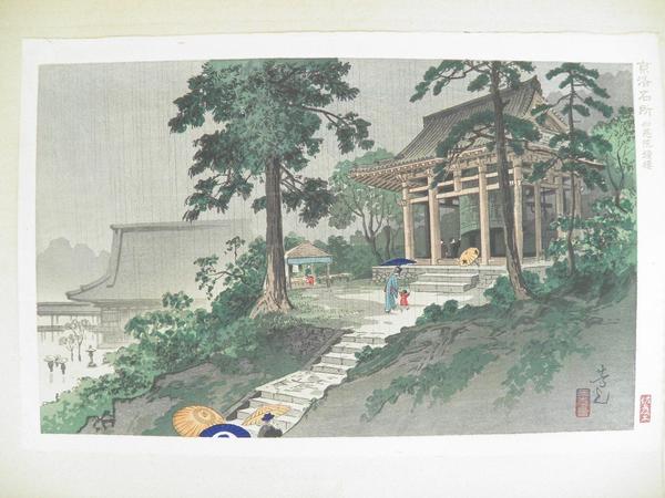 Notes (this edition) These notes were written by the original owner/seller/auctioner of the item and may be inaccurate.: | Great Bell at the Chionin Temple from the series Kyoraku Nesho (Famous scenes in Kyoto) by Nomura Yoshimitsu. Original woodblock print circa 1931. 9.6 x 15.0 inches. Same print displayed in the 1936 Toledo Exhibition. Print is in fine condition. Limited edition Numbered 108/200 on verso. (See verso image which reads: Ni Hyaku Ban Kagiri Zeppan Dai Hayaku Hachii Go.) Japanese title and Sato of Kyoto publisher's seal in right margin. Yoshimitsu characters and red Sankokai-in seal in lower right of image. 18 blocks used with 25 superimposed impressions. Compare with image 284 in the 1936 Toledo Exhibition Catalog. Rare and beautiful. |