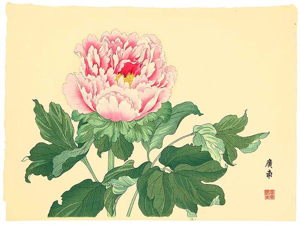 Description Large pink peony. Signature Konan. Seal Artist's seal. Dated Ca. 1910s. Publisher Unsodo. Medium/Technique Woodblock print. Impression Excellent - Very good … Later printing. Colors Excellent. Condition Excellent - Very good. Note Printer Takenaka. Width Item 21.5 inches = 54.5 cm Height Item 15.7 inches = 40.0 cm |
