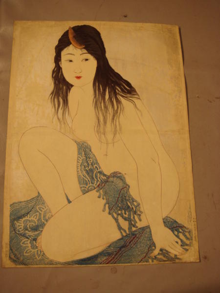 1931 Shotei Hiroaki Awabi Pearl Fisher Japanese Woodblock Print Guaranteed original woodblock fro the 1931 printing. Measures in inches:14 3/4 x 10 1/2 and the condition is Has centerfold, rubbed mica, soiling and creasing |